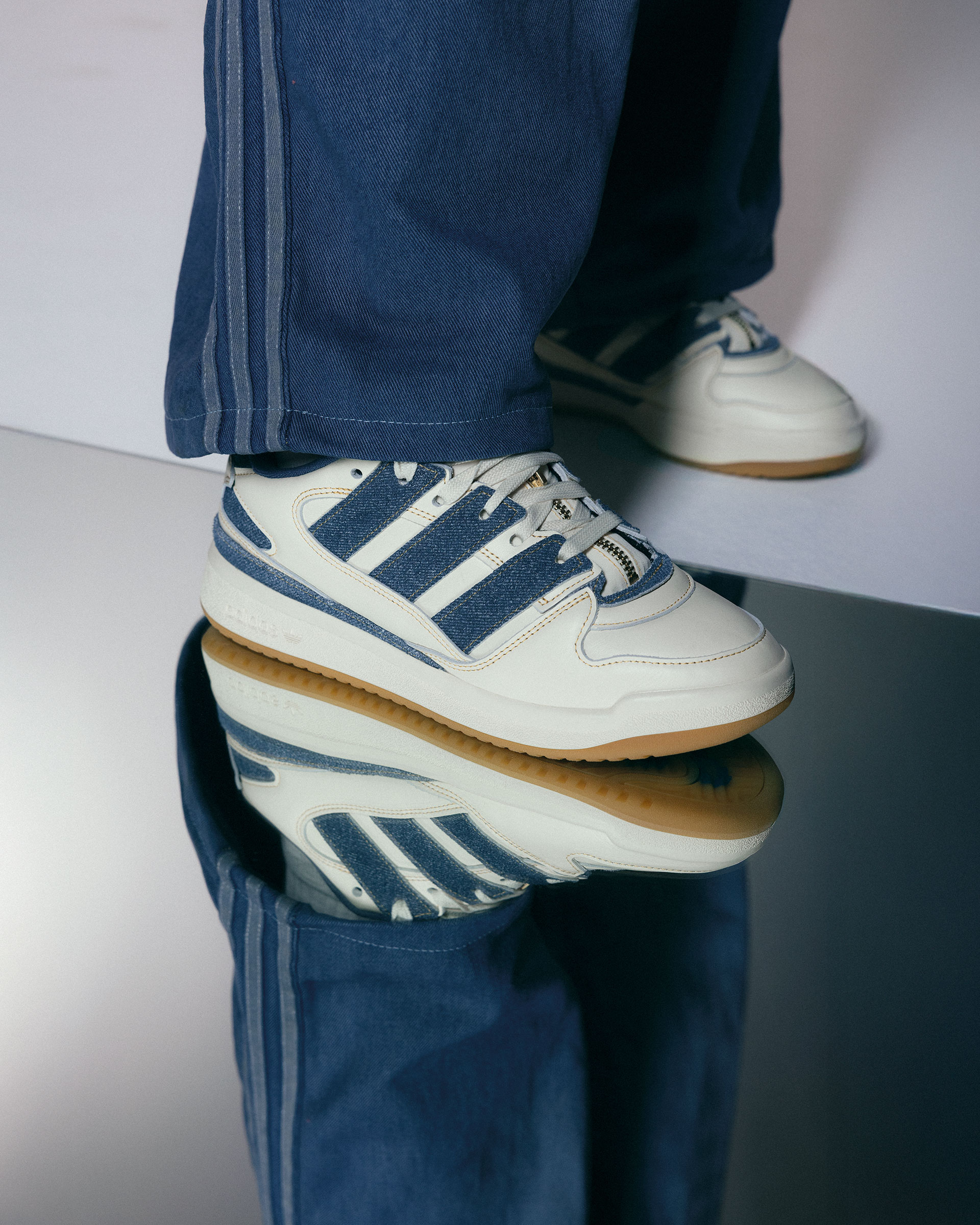 Las Forum 2000 x BZRP se destacan por su materialidad de cuero color Cream White y por las tres icónicas tiras con textura denim, marcando el regreso de este textil como ícono de moda. Su particular lengüeta se distingue por contener como novedad un cierre dorado – además la aplicación de logo de el Trifolio en el pie izquierdo y “BZRP” en el derecho -, reforzando la dualidad entre legado, la personalidad de Biza y la colaboración.
