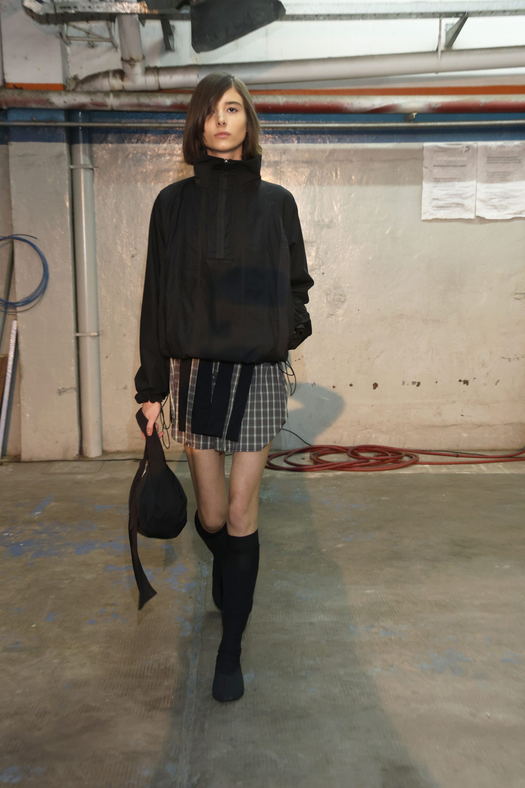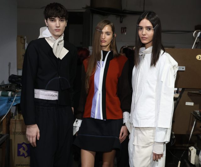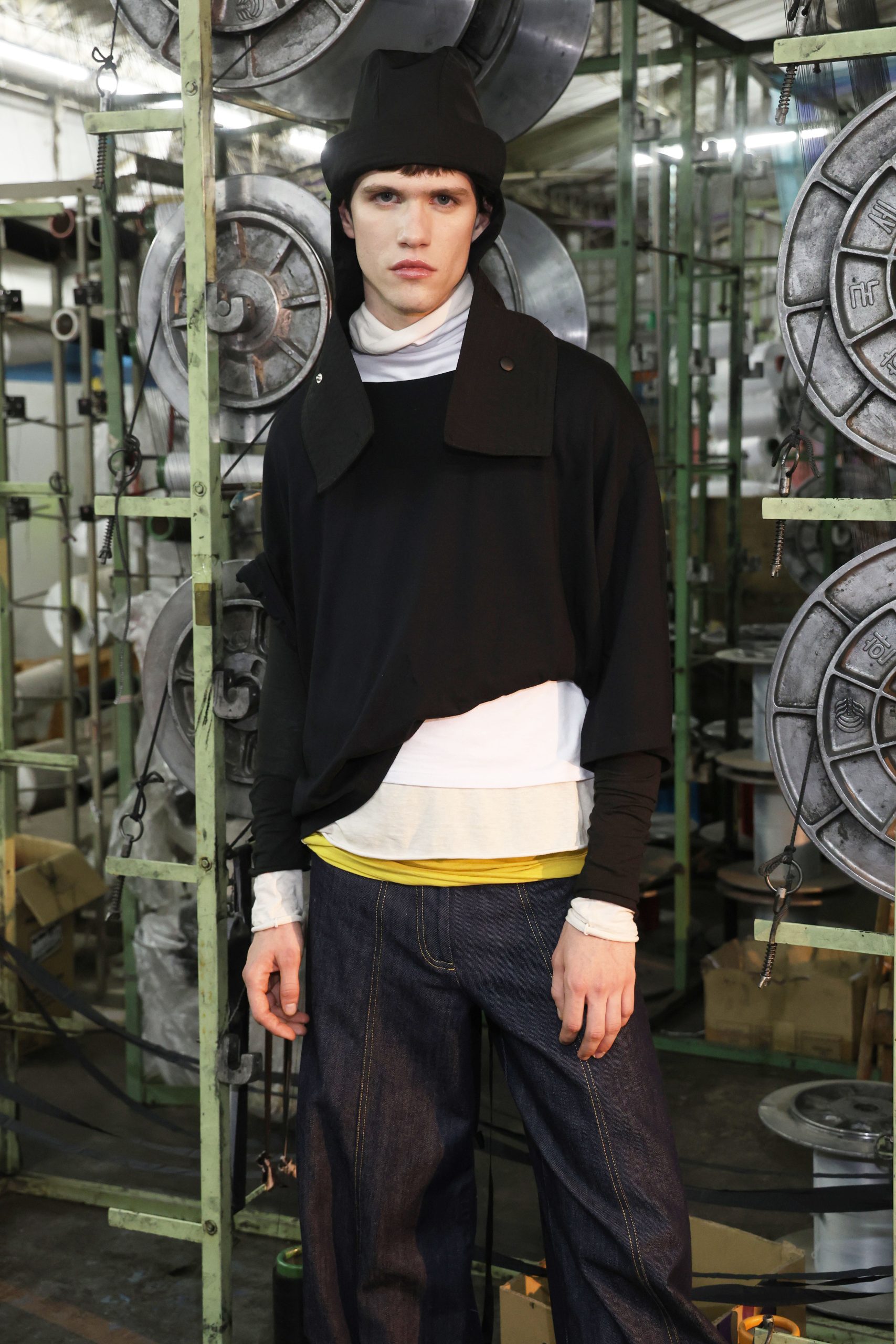 JT exploró la silueta a través de conjuntos de dos piezas en mimesis absoluta, presentes tanto en gabardinas clásicas como en denim. Los textiles evolucionaron hacia materiales técnicos e impermeables, pensados para la performance y la libertad de movimiento, incorporando elásticos super anchos y frunces extremos en cuellos y cinturas que enfatizan la tensión entre control y expansión.