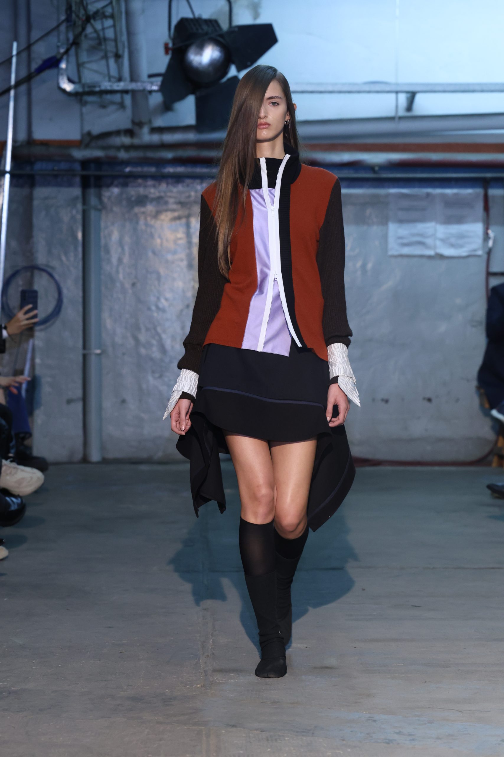 La colección propone figuras del círculo y el nudo como elementos estructurales, traduciéndose en gestos escultóricos que atraviesan mangas y piernas, aportando tensión y dinamismo a cada prenda.